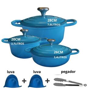 01un Panela com 20cm de diametro e 2,7litros01un Panela com 26cm de diametro e 3,4litros01un Panela com 28cm de diametro e 7,0litros02un Luva de silicone01un Pegador multiuso de silicone e inoxEstas Panelas são diferentes de tudo que voce ja viu, indispensáveis,não solta residuos nada gruda mesmo sem oleo ,é livre de PFOA, mantem o alimento quente por muito tempo e são leves de manusear podendo ser levadas do fogão à mesa de servir.