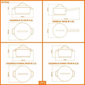 Muito importante: -- conferir produtos no ato do recebimento. Não aceitar produtos com embalagem violada amassado, rasgado, aberto, quebrado, etc , a recusa deve ser feita no ato. Conjunto de panelas allegra inox 4 peças fundo triplo 16, 18, 20 e 22 cm - tramontina Componentes do kit: - 1 panela allegra aço inox fundo triplo fogões de indução 16 cm 1,5 l - tramontina 62651161 - 1 caçarola allegra aço inox fundo triplo fogões de indução 22 cm 3,3l - tramontina 62653221 - 1 caçarola funda allegra aço inox fundo triplo fogões de indução 18 cm 2,2l - tramontina 62654181 - 1 caçarola funda allegra aço inox fundo triplo fogões de indução 20 cm 3,1l - tramontina 62654201 Panela allegra aço inox fundo triplo fogões de indução 16 cm 1,5 l - tramontina 62651161: Informações adicionais: - tipo: panela - material: aço inox - litragem: 1,5l - linha: allegra - possui revestimento Não Medidas do produto: - total com tampa : 13,9 cm a x 18 cm l x 33,3 cm p - embalado: 12 cm a x 25 cm l x 36 cm p - diâmetro interno: 16 cm - diâmetro externo: 18 cm - peso líquido: 0,6 kg - peso bruto: 0,85 kg Caçarola allegra aço inox fundo triplo fogões de indução 22 cm 3,3l - tramontina 62653221: Informações adicionais: - tipo: caçarola - material: aço inox - litragem: 3,3l - linha: allegra - possui revestimento Não Medidas do produto: - total com tampa : 16 cm a x 24,2 cm l x 29,6 cm p - embalado: 14 cm a x 25 cm l x 36 cm p - diâmetro interno: 22 cm - diâmetro externo: 24,2 cm - peso líquido: 0,89 kg - peso bruto: 1,30 kg Caçarola funda allegra aço inox fundo triplo fogões de indução 18 cm 2,2l - tramontina 62654181: Informações adicionais: - tipo: caçarola - material: aço inox - litragem: 2,2l - linha: allegra - possui revestimento Não Medidas do produto: - total com tampa : 15,5 cm a x 20,2 cm l x 25 cm p - embalado: 12 cm a x 22 cm l x 27 cm p - diâmetro interno: 18 cm - diâmetro externo: 20,2 cm - peso líquido: 0,82 kg - peso bruto: 0,90 kg Caçarola funda allegra aço inox fundo triplo fogões de indução 20 cm 3,1l - tramontina 62654201: Informações adicionais: - tipo: caçarola - material: aço inox - litragem: 3,1l - linha: allegra - possui revestimento Não Medidas do produto: - total com tampa : 16,5 cm a x 22,2 cm l x 27,5 cm p - embalado: 14 cm a x 24 cm l x 30 cm p - diâmetro interno: 20 cm - diâmetro externo: 22,2 cm - peso líquido: 0,95 kg - peso bruto: 1,13 kg Perguntas frequentes: - pode ir na máquina de lavar Pode sim. - é compatível com fogões por indução Sim, perfeitamente compatível. Também poderá utilizar nos modelos: gás, elétrico e vitrocerâmico - resistência elétrica - pode ser levado ao forno Sim, temperatura máxima de 260ºc. : 90 dias de legal para vícios ou defeitos de fabricação. Tamanho da embalagem: 32cm a x 36cm l x 25cm p Peso: 3,8 kg