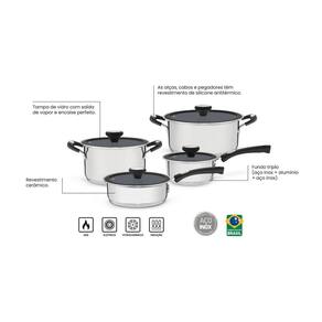 Os amantes da culinária confirmam, além de alimentos saborosos, uma deliciosa refeição precisa ser preparada em utensílios de qualidade. O Jogo de Panelas Tramontina Solar Ceramic em Aço Inox Fundo Triplo com Revestimento Interno Cerâmico Grafite com Cabos/Alças Silicone 4 Peças conjuga praticidade e segurança em toda sua linha. Altamente duráveis, as peças possuem revestimento cerâmico que ajuda a manter a umidade dos alimentos, permitindo um cozimento com pouca gordura, mais rápido e eficiente. O fundo triplo (aço inox alumínio aço inox) distribui o calor uniformemente, o que proporciona um cozimento mais rápido. As alças, cabos e pegadores têm revestimento em silicone antitérmico tornando o manuseio mais confortável. Todas as peças possuem tampa de vidro com saída de vapor e encaixe perfeito. O conjunto pode ser utilizados nos fogões: gás, elétrico, vitrocerâmico e indução e para limpar, basta colocar na máquina de lavar louça.