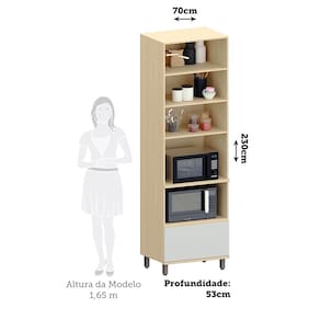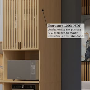Alem disso, a gaveta conta com corredicas telescopicas, proporcionando mais conforto ao abrir e fechar, e as 3 prateleiras internas sao perfeitas para organizar itens diversos na sua cozinha. O design inovador e moderno faz da torre uma excelente opcao para quem busca praticidade sem abrir mao da estetica. Produzido em 100 MDF.