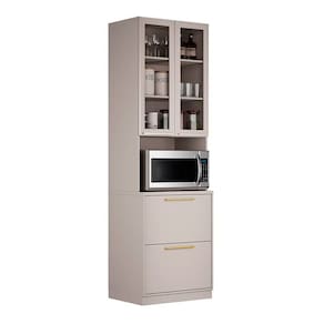 Qualidade nos mínimos detalhes: São 3 portas, sendo as 2 superiores de vidro para você colocar as louças e taças mais bonitas á mostra, 1 porta inferior em MDF com dobradiças slow motion e 1 gaveta também em MDF com corrediças telescópicas para guardar garfos, facas, panos, toalhas e o que mais você quiser, além de 1 nicho com espaço para micro-ondas ou forno elétrico. Agora é só escolher como aproveitar!