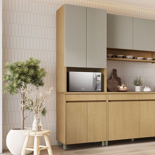Com o charme das portas ripadas, nosso paneleiro da SIMONE MENDES é o upgrade que sua cozinha está pedindo! Além de um nicho perfeito para o micro-ondas, ele traz uma gaveta angular que é puro charme e praticidade para organizar tudo de forma prática. Sabe aquela mistura de estilo e funcionalidade que faz a diferença no dia a dia? Pois é, ele tem de sobra! Com um design que deixa qualquer ambiente moderno e elegante, esse paneleiro vai transformar sua cozinha no cantinho mais descolado da casa. Quer dar um toque de personalidade e ainda ganhar espaço? Esse paneleiro vai te conquistar! Acabamento da Gaveta: Impressão Acabamento da Porta: Impressão Acabamento da Prateleira: Impressão Altura dos Pés: 10 cm Ambiente Principal: Cozinha Complexidade da Montagem: Alta: deve ser montado por um montador especializado Cor: Carvalho/Greige Cor do Produto: Carvalho/Greige Escala de Brilho: Semi-Brilho Escala de Brilho da Gaveta: Semi-Brilho Escala de Brilho da Porta: Semi-Brilho Escala de Brilho da Prateleira: Semi-Brilho Gaveta com Chave: Não Informações Complementares: Robustas dobradiças Caneco 35 mme conforto tecnológico slow motion. Gavetas com corrediças telescópicastrês estágios e abertura total. Itens Inclusos: 1 Paneleiro, Kit Ferragens e Manual de Montagem Manual de Montagem e Instalação: https://product-hub-prd.madeiramadeira.com.br/952307/documents/d6181348-2218-4fb1-83ee-fc4849f73237237506873217272084014328.pdf Material da Dobradiça/Corrediça da Porta: Metálica Material da Gaveta: MDF Material da Porta: MDF Material da Prateleira: MDF Material dos Pés: Plástico Necessita Montagem: Sim Origem do Produto: Nacional Pés Reguláveis: Sim Peso: 69,7 kg Peso Máximo por Gaveta: 15 kg Peso Máximo por Prateleira: 5 kg Possui Espelho: Não Possui Possui Pés: 04 Possui Portas: 04 Possui Prateleiras: 03 Possui Rodízio: Não Recomendações de Uso, Manutenção e Limpeza: Utilizar pano macio levemente umedecido e na sequencia pano macio seco. Sapatas Niveladoras: Sim Sistema de Montagem: Parafusos, kit de ferragem Tipo de Corrediça da Gaveta: Telescópica Tipo de Dobradiça/Corrediça da Porta: 35 mm Tipo de Puxador da Gaveta: Embutido Tipo de Puxador da Porta: Embutido