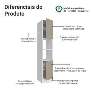 O acabamento branco da estrutura e as portas no tom crema trazem elegância, com textura suave ao toque, que adiciona leveza ao ambiente. O puxador em ouro envelhecido, feito de metal resistente, confere personalidade e charme. O detalhe chanfrado nas frentes cria molduras elegantes, dando profundidade ao design e refletindo o estilo americano com um toque moderno.