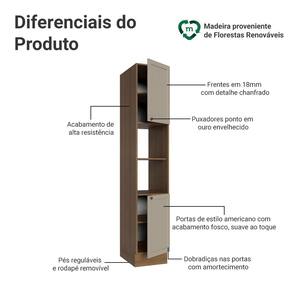 O acabamento amadeirado rustic da estrutura e as portas no tom crema trazem elegância, com textura suave ao toque, que adiciona leveza ao ambiente. O puxador em ouro envelhecido, feito de metal resistente, confere personalidade e charme. O detalhe chanfrado nas frentes cria molduras elegantes, dando profundidade ao design e refletindo o estilo americano com um toque moderno.