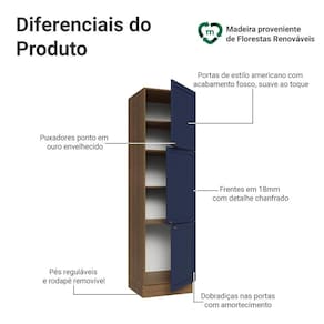 O acabamento fosco de alta resistência da estrutura é em amadeirado Rustic e das portas em Azul, refletindo o estilo americano com um toque moderno. Possui uma textura suave ao toque, trazendo leveza e sofisticação ao ambiente. O destaque vai para os puxadores ponto em ouro envelhecido, feitos com metal resistente, que adicionam personalidade e um charme único.