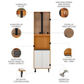 A iluminação em LED embutida é um diferencial que realça ainda mais o visual do móvel, criando um toque especial no ambiente. Conta com Nicho Para Micro-ondas ou forno elétrico, que otimiza o espaço e facilita o uso no dia a dia. Com três prateleiras internas, possui excelente capacidade de organizar os utensílios de forma prática e eficiente.
