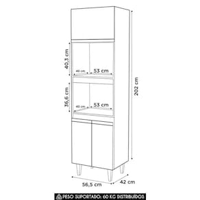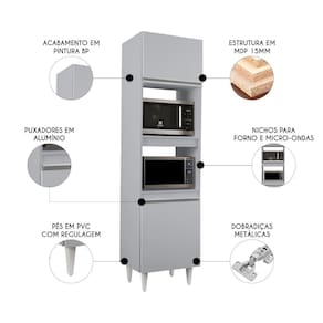 As dobradiças metálicas garantem abertura suave e maior vida útil. Os nichos acomodam forno elétrico, micro-ondas ou utensílios, facilitando a rotina diária.