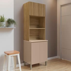 Com dois nichos para acomodar micro-ondas e forno elétrico, o Paneleiro Duplo conta com práticos passa fios adesivos, que mantêm um visual clean ao ocultar os cabos. A parte superior apresenta uma porta basculante com textura em riscatto, que adiciona um toque de elegância ao Paneleiro, enquanto o pistão a gás facilita o uso diário. Na parte inferior, as duas portas convencionais com frente em textura dot permitem diversas combinações com diferentes estilos de decoração.