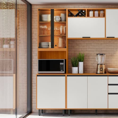 Informações Complementares: Cristaleira com vidro transparente, iluminação LED, nicho para micro-ondas, prateleira interna, dobradiças 26mm, puxadores em polímero, pés PVC reguláveis, em MDP pintura UV.