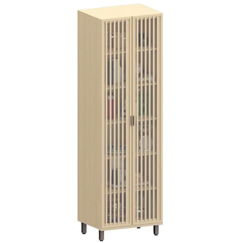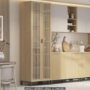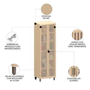 As portas com dobradiças metálicas e com sistema de amortecimento garantem um fechamento suave, enquanto os detalhes ripados e o vidro transparente lembrando o estilo de uma Cristaleira, trazem um toque muito mais elegante ao ambiente.