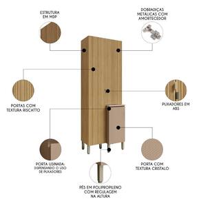 Fabricado em MDP de 12 e 15mm com acabamento em pintura UV, o Paneleiro garante resistência no uso diário. As portas na parte superior possuem puxadores em ABS e textura riscatto, combinando perfeitamente com a porta inferior que apresenta textura dot e confere ao Paneleiro de Cozinha um visual moderno. As dobradiças metálicas com amortecedor proporcionam um fechamento suave e sem impactos.