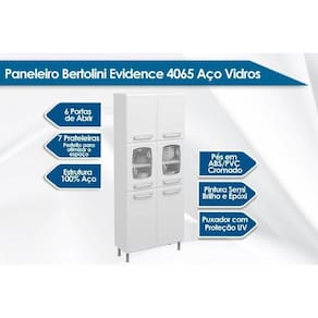 Todas as informações divulgadas são de responsabilidade exclusiva do fabricante/fornecedor. Tipo de Estrutura do Móvel: 100% aço | Quantidade de Portas: 6 Portas de Abrir | Quantidade de Prateleiras: 7 Prateleiras | Garantia: 3 meses | Tipo de Pintura: Epóxi | Características de móveis: Paneleiro Duplo | Tipo de Acabamento da Pintura: Semi Brilho | Tipo de puxador: c/ Proteção UV | Características Gerais da Cama Box: Sapatas Reguláveis | Garantia de Fábrica: Garantia de Fábrica | Cor Principal: Branco | Com prateleiras: Sim | É kit: Não | Requer montagem: Sim | Inclui Tampo: Não | Material das alças: Plástico | Fonte do produto: N/A | Material das corrediças: Metal | Tipo de móveis de cozinha: Balcão | Materiais do corpo: Melamina | Alto do armário: N/A | Alto do balcão: N/A | Ancho do armário: N/A | Ancho do balcão: N/A | Modelo detalhado: N/A | Condição do item: Novo | Produto: N/A | Quantidade de gavetas: 0 | Código universal de produto (GTIN): 7890986778511 | Condição do Item: Novo | Link Site: https://www.costaricacolchoes.com.br/produtos.asp?produto=23930 | Numeral: 0 | Não se Aplica: N/A | Não Possui: Não | Link Youtube: https://www.youtube.com/watch?v=eFO3Y3_RLXc | ID Youtube: eFO3Y3_RLXc | Linha/Modelo: Evidence | Cor Cnova: Blush | Cor Meli: Branco | Categoria Trilha: Móveis de Cozinha> Paneleiro de Cozinha | Categoria - Sub: Paneleiro de Cozinha | Categoria - Pai: Móveis de Cozinha | Comprimento Embalagem: 28.00 | Largura Embalagem: 80.00 | Altura Embalagem: 191.00 | Peso: 28.95 Kg | Kit: 0 | Peso Real Kg: 28.95 | Peso Cubado: 25.00 | Volumes: 1 | M3: 0.10 | Comprimento/Profundidade: 28 cm | Largura: 80 cm | Altura: 191 cm | Tamanho Montado: Larg:80.00 x Comp/Prof:28.30 x Alt: 191.20 | Comprimento/Profundidade Montado: 28.30 | Largura Montado: 80.00 | Altura Montado: 191.20 | Cor Fabricante: Branco | Data Cadastro: 2023-8-1 8:5:43 | Sigla Estoque: 2 | Marca: Bertolini