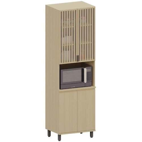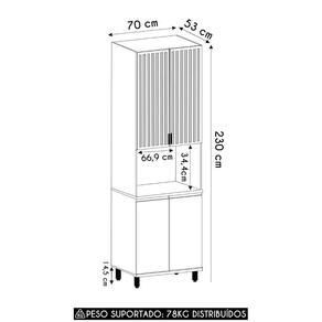As portas com dobradiças metálicas do Paneleiro de Cozinha garantem um fechamento suave e sem ruídos. O detalhe ripado e o vidro nas portas superiores trazem um toque de elegância, ideal para exibir itens com charme.