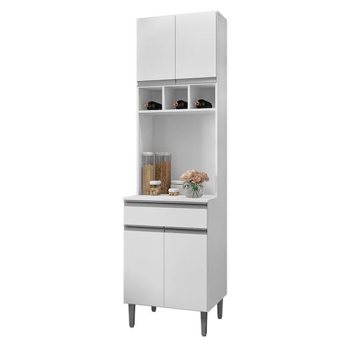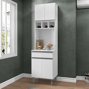 O Paneleiro Duplo Andréia, versátil para uso isolado ou como complemento a Cozinha Modulada Andréia, é a escolha ideal para quem busca qualidade e sofisticação ao planejar sua cozinha. Sua estrutura é fabricada em MDP, com um acabamento em pintura UV. O móvel é composto por quatro portas equipadas com dobradiças metálicas, um tampo com espaço destinado para micro-ondas ou outros aparelhos domésticos, uma gaveta com corrediças telescópicas, três nichos para garrafas, prateleira interna para utensílios de cozinha, puxadores em alumínio e pés reguláveis.