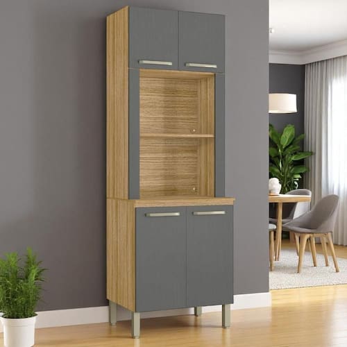 Produzido em MDP de 15 mm., madeira reconstituída provinda de reservas manejadas para este fim, é um produto ecologicamente correto. Nas quatro portas são utilizadas dobradiças 100% metálicas que garantem facilidade e segurança no abrir e fechar das portas. Dispõe de amplo espaço interno para melhor organizar os objetos da cozinha, além de um micho para microondas e forno elétrico. Os puxadores são ergônomicos em plástico resistente. Em sua base utiliza pés reguláveis em plástico resistente que propicia perfeita montagem mesmo em pisos com pequenos desníveis.