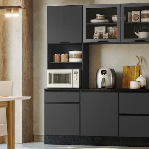 O Paneleiro Duplo 02 portas 1 gaveta Etina Poliman é o produto ideal para quem procura praticidade. Dispõe de espaço para micro-ondas (A.40cm x L.55cm x P.50cm), nicho decorativo (A.28,5cm x L.55cm x P.29,5cm), 02 portas de bater, diferencial de 01 gaveta com corrediças telescópicas, dobradiças reforçadas de 35mm, prateleiras, puxadores perfil em polímero na parte inferior e puxador em metal preto na parte superior, pés em PVC 14,5cm reguláveis e rodapés com presilhas modelo click que possibilitam a remoção. Produto em MDP com pintura UV. Produto ecologicamente correto com embalagem preparada para evitar danos e permitir que o produto chegue em perfeito estado em sua casa. Perfeita combinação com os mais variados ambientes. Qualidade que só a Poliman oferece em seus produtos. Acabamento da Gaveta: Pintura UV Acabamento da Porta: Pintura UV Acabamento da Prateleira: Pintura UV Acompanha Rodapé Decorativo: Sim Altura dos Pés: 14,5 cm Ambiente Principal: Cozinha codigo_ean: 7900288107398 Complexidade da Montagem: Média: pode ser montado por mais de uma pessoa e/ou necessite de maior conhecimento para montagem Cor: Grafite Cor do Produto: Grafite Cor dos Pés: cinza Cor Flex: não Cor Interna: Garfite Escala de Brilho: Fosco Escala de Brilho da Gaveta: Fosco Escala de Brilho da Porta: Fosco Escala de Brilho da Prateleira: Fosco Gaveta com Chave: Não Informações Complementares: Espaço para micro-ondas, portas de bater, dobradiças resistentes de 35mm, prateleiras, gaveta com corrediças telescópicas, pés PVC reguláveis, rodapés removíveis com presilhas modelo click, em MDP pintura UV. Itens Inclusos: 1 Paneleiro Linha ou Coleção: Cozinha Modulada Etina Manual de Montagem e Instalação: https://product-hub-prd.madeiramadeira.com.br/983689/documents/761e21df-0aa7-453a-9fc8-9ac3162c5b11277755849317435367764986.pdf Marca: Poliman Móveis Material da Corrediça: Metálica Material da Dobradiça/Corrediça da Porta: Metálica Material da Gaveta: MDP Material da Porta: MDP Material da Prateleira: MDP Material do Puxador da Gaveta: Plástico Material do Puxador da Porta: Plástico Material dos Pés: PVC Montagem Flex: não Necessita Montagem: Sim Origem do Produto: Nacional Pés Reguláveis: Sim Peso: 42,3 kg Peso Máximo por Gaveta: 2 kg Peso Máximo por Prateleira: 3 kg Possui Espelho: Não Possui Possui Pés: 04 Possui Portas: 02 Possui Prateleiras: 02 Possui Rodízio: Não Recomendações de Uso, Manutenção e Limpeza: Para limpeza utilize pano macio levemente umedecido e na sequência pano seco. Não usar produtos químicos ou abrasivos. Sapatas Niveladoras: Não Sistema de Montagem: Parafusos, pregos, cavilhas. Tipo de Corrediça da Gaveta: Telescópica Tipo de Dobradiça/Corrediça da Porta: 35 mm Tipo de Paneleiro: Paneleiro Duplo Tipo de Puxador da Gaveta: Externo Tipo de Puxador da Porta: Externo