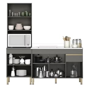 São móveis práticos e funcionais para a Cozinha. O Paneleiro Torre Quente e o Balcão Gabinete Para Pia são excelentes para guardar utensílios, mantimentos, louças e eletrodomésticos com aproveitamento de espaço conta também com prateleira interna para melhor organização. Ah! O balcão acompanha Pia Inox de 150cm com cuba e válvula. Além disso, ele tem um design moderno e uma pintura UV, puxadores em alumínio, e dobradiças metálicas que garante maior durabilidade e resistência aos móveis.