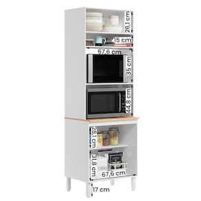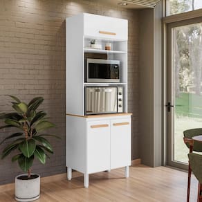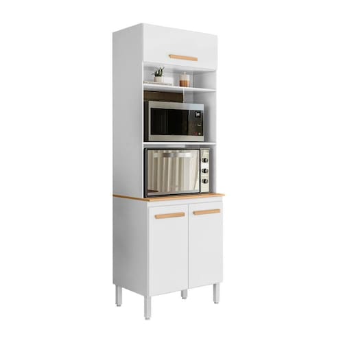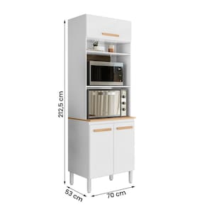 Modelo: Paneleiro Torre Quente; Altura: 212,5 cm; Largura: 70 cm; Profundidade: 53 cm; Material da estrutura: MDP; Quantidade de portas: 03, sendo 1 basculante com pistão; Material de dobradiças: Metálicas; Quantidade de gavetas: Não se aplica; Com puxador: Sim, em MDF; Quantidade prateleiras: 02; Pés com regulagem: Sim; Peso suportado: até 70 kg distribuídos; Requer montagem: Sim (kit montagem incluso);