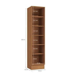 Para um melhor acabamento, a cristaleira conta com rodapés, mas acompanha as ferragens para ser montada suspensa, e se preferir, pode adquirir os pés separadamente, garantindo muita praticidade. A peça ideal para quem busca por otimização de espaço na vertical, medindo 220cm de altura, 50cm de largura e 52cm de profundidade, conta com duas portas e seis prateleiras, ideal para guardar louças e mantimentos, facilitando a organização e o preparo de receitas.