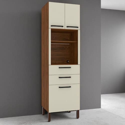 O Paneleiro possui três gavetas de tamanhos distintos que permitem liberdade para melhor organização do espaço, além de nicho para eletrodomésticos diversos e duas gavetas com ampla abertura garantida pelas corrediças telescópicas, para fechar, conta com puxadores ergonômicos feitos em plástico resistente.