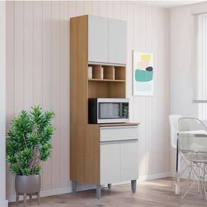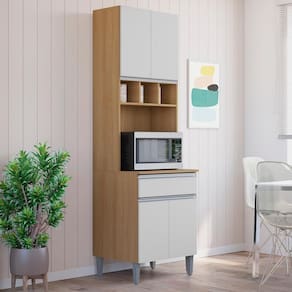 Paneleiro Andreia, desenvolvido para oferecer praticidade e elegância à sua cozinha. Produzido em MDP 12/15 mm (fundo 3 mm) com acabamento em pintura UV. Possui portas e gavetas com dobradiças e corrediças metálicas, puxadores em alumínio, prateleira interna e nichos adega superiores para armazenar vinhos ou garrafas. Conta também com espaço para forno ou micro-ondas e pés plásticos com regulagem (altura de 17 cm). Produto entregue em 02 volumes.