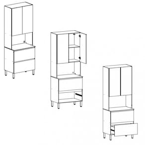 Características: 3 Portas 1 Gaveta 1 Prateleira 4 Pés reguláveis Acabamento em pintura UV Corrediças telescópicas Dobradiças com amortecedor Estrutura em MDP de 12 e 15 mm Porta basculante com pistão a gás Possui passa Fio Adesivo Puxadores usinados a 45°