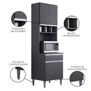 Características do Produto Material da Estrutura: MDP 15 mm. Material do Fundo: MDF 3 mm. Acabamento: Pintura UV. Peso Suportado: 55 kg distribuídos. Escala de Brilho: Fosco. Quantidade de Portas: 4 Portas. Material da Porta: MDP. Tipo de Porta: Convencional. Tipo de Puxador: Alumínio. Tipo de Dobradiças: Metálicas. Possui Gavetas: Sim. Quantidade de Gavetas: 1 Gaveta. Tipo de Corrediças: Metálicas. Possui Nichos: Sim. Quantidade de Nichos: 4 Nichos. Possui Prateleiras: Sim. Quantidade de Prateleiras: 1 Prateleira. Material da Prateleira: MDP. Possui Gavetas: Sim. Quantidade de Gavetas: 2 Prateleiras. Diferenciais: - Nicho para forno ou micro-ondas. - Nichos para decoração. - Design moderno. - Amplo espaço interno. Sistema de Montagem: Cavilhas/Parafusos. Manual de Montagem: Sim. Complexidade da Montagem: Média. Volumes: 2 Volumes. Conteúdo da Embalagem: 1 Paneleiro. Garantia do Fabricante: 90 dias contra defeito de fabricação. Montagem: Recomendamos que seja feita por um profissional. Recomendação de Limpeza: Utilize pano úmido.