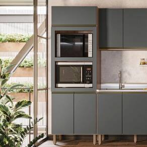 Com duas portas inferiores equipadas com dobradiças metálicas já com amortecedores, garante um fechamento suave e silencioso, ideal para evitar ruídos na cozinha, e uma prateleira interna que oferece espaço adicional para armazenar itens diversos. A porta superior basculante com pistão a gás do Paneleiro proporciona acesso fácil e seguro aos compartimentos mais altos. O uso de MDF de 15mm com acabamento em pintura UV não só assegura durabilidade e resistência, mas também confere ao móvel um acabamento liso e brilhante. Os puxadores de alumínio complementam o design com um toque de sofisticação e resistência à corrosão. Além disso, os nichos dedicados para forno e micro-ondas são pensados para integrar os eletrodomésticos ao móvel, otimizando o espaço e contribuindo para uma Cozinha mais organizada e harmoniosa.
