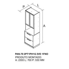 A Torre possui nicho para forno que possibilitam a versatilidade do móvel tornando-o mais espaçoso, conferindo praticidade e usabilidade no dia a dia. As 2 portas superiores são de vidro transparente com molduras e aço.