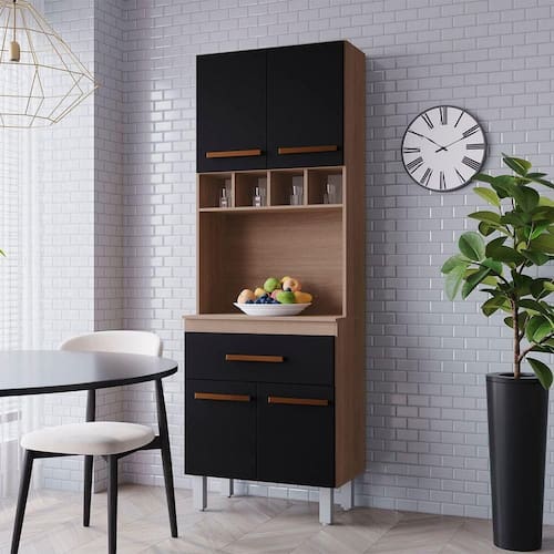 Paneleiro alto com armários superiores e inferiores, nicho central com divisórias para utensílios e bancada de apoio. Possui gaveta, puxadores horizontais e pés elevados que facilitam a limpeza. Funcional e ideal para organizar a cozinha com praticidade.Dimensões do Paneleiro:Altura: 197 cmLargura: 60 cmProfundidade: 38/25,50 cmCaracterísticas Técnicas:- Chapa MDP- Caixote 12mm- Portas 15mm- Acabamento em pintura U.V- 04 Portas- 01 Gaveta- Dobradiças metálicas- Corrediça telescópica- Puxadores plástico- Pés com regulagem- Altura pé 16 cmDiferenciais do Paneleiro Zínia:- Material da Estrutura: fabricado com MDP12/15mm- Detalhes do Paneleiro: Dobradiças Reforçadas; Corrediças telescópica; Puxadores Horizontais, finalizados com um excelente acabamento;Recomendações de limpeza:-Limpar com flanela limpa e seca. Não molhar o móvel e não expor em lugar úmido ou próximo de fontes de calor. Não usar produtos abrasivos.