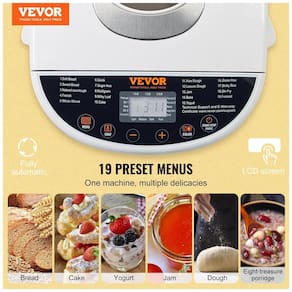 As dimensões do produto são 14,1 x 11,4 x 28,96 cm e 360 x 290 x 289 mm. O conteúdo da embalagem inclui 1 máquina de fazer pão, 2 lâminas de mistura, 1 copo medidor, 1 colher medidora, 1 gancho para remoção de lâmina, 1 luva resistente ao calor e 1 manual do usuário. Possuindo 19 programas de funções, esta máquina de fazer pão é como ter uma ferramenta de cozimento multifuncional. Além de vários tipos de pão, ela também pode fazer massa, geléia, bolo, sanduíches e outros produtos assados.