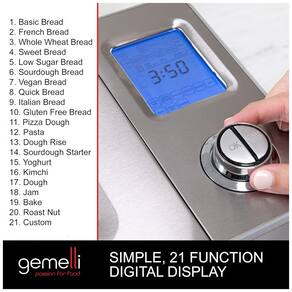 GEMELLI HOME 2LB ARTISAN Bread Maker Faça pão caseiro com a máquina de fazer pão fácil da Gemelli. O design intuitivo é simples de usar e o exterior elegante em aço inoxidável é bonito em qualquer cozinha. A forma fundida é completamente antiaderente e cria pães grandes e uniformes. O Gemelli Home também incluiu uma janela de visualização para que você possa monitorar facilmente seu pão enquanto ele assa. Inclui pá de amassar, gancho de pá, copo medidor de líquido, colher medidora e 22 receitas testadas e comprovadas 21 FUNÇÕES Com 21 funções exclusivas, o pão fresco da padaria está a algumas seleções de distância. Escolha entre receitas tradicionais, como branco e trigo, ou aventure se com as variedades de fermento ou italianas. As funções são impressas na parte superior da unidade. Mas o pão não é tudo que você pode fazer faça massa de pizza e macarrão ou algo para combinar com seu pão, como geléia, iogurte ou kimchi. TELA DIGITAL A Máquina de Pão Artesanal da Gemelli Home apresenta uma tela LCD de fácil leitura que permite controlar e escolher facilmente sua opção. O botão de seleção e os botões são simples e facilitam o preparo do pão. Dentro do display digital você tem a opção de atrasar o início da sua receita por até 13 horas. Você também pode utilizar a configuração Keep Warm, para que seu pão esteja fresco e pronto quando você estiver