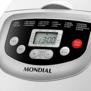 Pãozinho saudável e quentinho pronto quando você quiser. A Panificadora da Mondial conta com 19 opções de pré-programação para você preparar diversos tipos de pães, bolos e massas. Seu painel digital facilita a visualização do tamanho dos pães, seus ciclos e o timer para preparo. Acorde e tome seu café com pão quentinho: seu timer permite programar o preparo com até 15 horas de antecedência. Ajuste a tonalidade do pão entre claro, médio ou escuro e também a quantidade de receita, 500g, 750g ou 1kg. Características: - 19 programas de preparo - Potência de 600W - Timer de 15 horas - Forma antiaderente - Design moderno - Painel digital - Ajuste de Tonalidade (Claro, Médio e Escuro) Ficha Técnica Marca: Mondial Modelo: Master Bread Npf-54 Cor: Branca Voltagem: 110v Potência: 600W Consumo: 0,6 kW/h Medidas do produto (AxLxP): 32,5x30,5x35,3 cm Peso aproximado: 4,3 kg Garantia: 12 meses Conteúdo Da Embalagem: 01 Panificadora Automática Mondial Master Bread Npf-54 110V Sobre a Mondial A Mondial é uma empresa que oferece uma linha completa de produtos com destaque para o design moderno, qualidade e preço adequado, atendendo aos desejos de clientes e consumidores. A marca realiza pesquisas constantes junto a consumidores e o trabalho de técnicos e engenheiros resultam em produtos que estão em constante inovação e evolução.