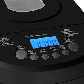 Panificadora Elétrica Multi com 18 funções pré-programadas, 3 tamanhos de pães (350g, 680g e 900g), controle de cor da crosta, modo personalizado, timer inteligente até 15h, forma e tampa removíveis.Porta-fio