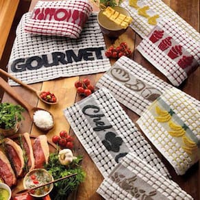 Pano de copa felpudo encorpado e absorvente, com 5 motivos variados nas barras, Os panos de copa