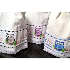 Jogo fabricado em tecido 100% algodão, com barrado em laise na cor branco, com desenhos bordados em ponto cruz, de corujinha, nas cores azul claro e escuro, roxo e lilás, preto e cinza, folhas e flores nas cores vermelho, amarelo e verde, detalhes em passa fitas.