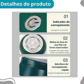Papa bolinhas durável blusas Descrição do anúncio: O papa bolinhas recarregável é a solução prática e eficiente para renovar suas roupas e tecidos. Compacto, leve e fácil de usar, remove fiapos, bolinhas e pelos de forma rápida, mantendo suas peças sempre com aparência de novas. Conta com bateria interna recarregável via usb, lâminas de aço afiadas e design ergonômico para maior conforto no uso. Ideal para diversos tipos de tecido, oferece desempenho potente e seguro. Conteúdo da embalagem: 1 papa bolinhas recarregável 1 cabo usb para recarga 1 escova de limpeza 1 lâmina extra de reposição 1 manual do usuário Características: Design portátil e moderno Lâminas de aço inoxidável com grade protetora em favo de Recarga rápida por porta usb Uso sem fio, garantindo praticidade Leve, silencioso e fácil de transportar Seguro para todos os tipos de tecidos Especificações: Potência: 8w Alimentação: bateria interna recarregável 1200mah Tempo de uso contínuo: até 2 a 4 horas dependendo do modelo Tempo de carregamento: aproximadamente 3 a 4 horas Porta de carregamento: usb Peso médio: 120g - 180g Dimensões aproximadas: 8 6 13 cm Principais perguntas: O produto funciona em todos os tipos de tecido Sim, pode ser em roupas, cobertores, sofás, casacos, camisetas, pelúcias e muito mais. Ele precisa de pilhas Não, possui bateria interna recarregável via usb. Pode ser durante o carregamento A recomendação é carregar totalmente antes de usar para maior durabilidade da bateria. As lâminas podem ser substituídas Sim, acompanha lâmina extra e pode ser trocada facilmente. O produto danifica as roupas Não, possui grade de proteção que evita contato direto da lâmina com o tecido.