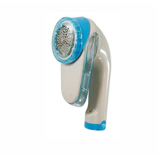 Design moderno e ergonômico Perfeito para usar em casa ou levar em viagens Recipiente para fiapos transparente e destacável Grade metal segura Fácil de manusear Botão liga / desliga Branco e Azul 20 cm PVC Rígido