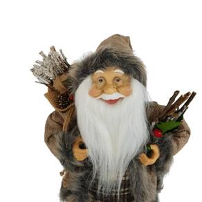 Papai Noel em pé com saco de presentes nas costas, estrutura em Polipropileno com 45 cm de altura, roupas em lã, pele artificial, feltro e poliéster.