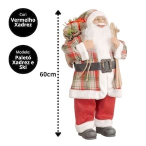 Papai Noel Decorativo de 60cm – Modelo em Pé com Casaco Xadrez Vermelho, Saco de Presentes e Ski