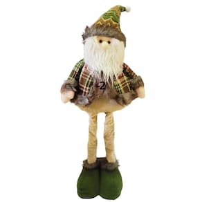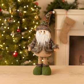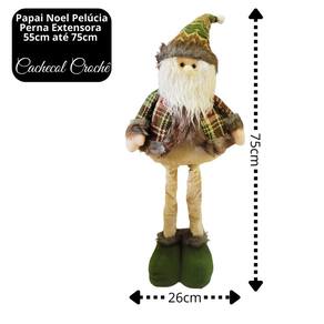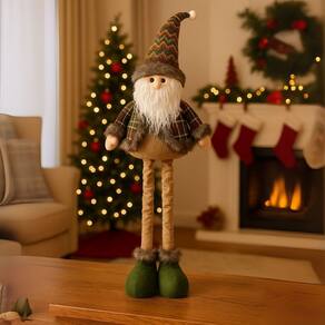 Traga ainda mais charme e sofisticação para sua decoração natalina com o Papai Noel Decorativo em pelúcia premium, nas cores champanhe e verde xadrez, com pernas retráteis extensíveis que variam de 55cm a 75cm de altura.