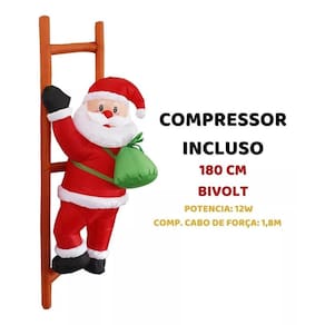 1 Papai Noel Inflável na Escada 1,80m 1 Fonte de alimentação - BIVOLT 1 Soprador de ar 2 Cabos fixadores