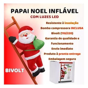 Produto Decorally Home Decor: Desenvolvido com qualidade e atenção aos detalhes, tornando sua decoração natalina especial. Design Divertido: Papai Noel escalando a escada traz uma atmosfera alegre e envolvente para sua decoração. Tamanho Ideal: Com 1,80m de altura, é perfeito para destacar qualquer espaço, seja em jardins, sacadas ou dentro de casa. Fácil Instalação: O inflador embutido garante montagem rápida e prática. Basta conectar à tomada e seu Papai Noel estará pronto para subir a escada Iluminação LED: Equipado com luzes LED, criando um efeito mágico e luminoso durante a noite.