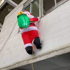 Papai Noel Inflável com uma mochilinha de presentes, subindo animadamente numa corda! Ele está escalando com toda a sua alegria natalina, pronto para trazer magia e encantamento à sua casa ou comércio, conquistando todos os olhares e garantindo um toque especial à sua fachada.