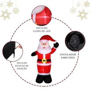1 Papai Noel inflável 2,40mt 1 Fonte de alimentação 1 Soprador de ar 2 Cabos fixadores