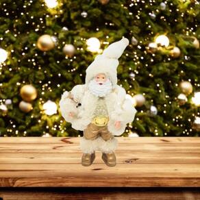 Transforme seu Natal com o Papai Noel Mini em pelúcia branco e dourado, um símbolo de sofisticação e magia para as festas!