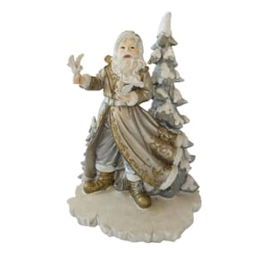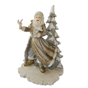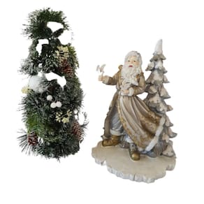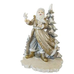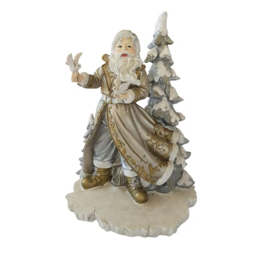 Papai Noel sobre base em resina com árvore atrás, 2 pombas nas mãos, confeccionado em resina na cor prata com ouro velho. Um peça em resina de excelente qualidade e perfeito acabamento como os traços do rosto e roupas, assim como a pintura, perfeita. Ideal para aquela decoração mais clean para sobrepor em aparador, balcão, painel, mesinha, Hall de entrada, escritório, recepção de consultório/clinica ou onde seu bom gosto levar.
