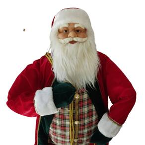 Papai Noel com 1,23 metros de altura, estrutura reforçada em Polipropileno e braços em polietileno com reforço de arame. As roupas em material Premium como o casaco vermelho e verde em veludo com bordas de pele branca e renda dourada, calça e gorro em veludo com barras de pele branca, o colete em poliéster xadrez com renda dourada e botões na cor pérola, o saco de presentes em veludo verde e o rosto, perfeito e carismático, são detalhes que o deixam mais charmoso e fofo.