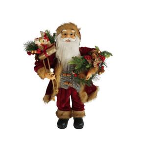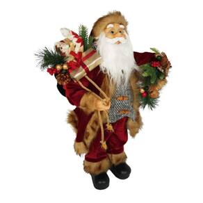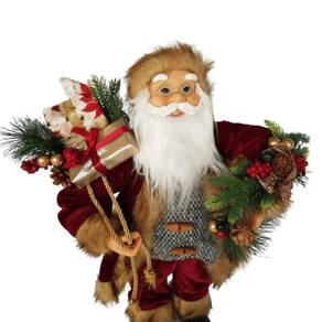 Papai Noel com estrutura em polipropileno 60cm de altura usando Óculos, segurando Saco de Presentes, vestindo colete em Poliéster cinza com botões em madeira com Gorro, Casaco e calças em veludo vermelho. Bordas do Casaco, gorro e calça com pele artificial caramelo. Saco de veludo verde com galhos e pacotes de presentes e botas pretas.