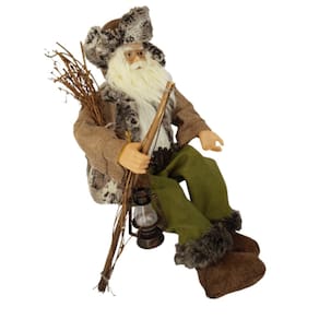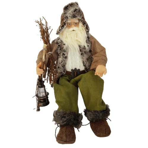 Papai Noel Verde com estrutura em polietileno 70cm de altura sentado, usando Óculos, gorro de Feltro com pele,segurando lanterna e maço de gravetos. O Gorro marrom, o Casaco de pele com mangas de poliéster, a calça de feltro verde, a blusa de tricô branca, o cinto de couro sintético com fivela de meatal e as Barras da Calça em pele artificial são um charme a parte que deixa ele ainda mais fofo e simpático. Confeccionada com materiais PREMIUM e acabamento finíssimo, lindo, perfeito!